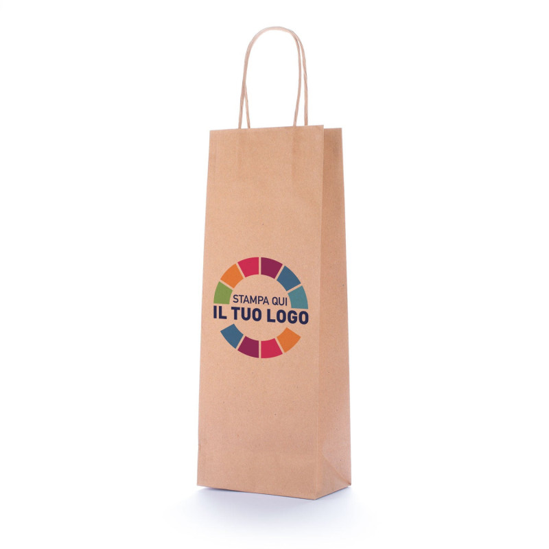 Shopper carta per bottiglie personalizzabili con il logo a colori su 1-2 lati. Shopper in pura polpa di cellulosa con manico in cordino, 110gr/mq, riciclabile. Massima resistenza per 1 bottiglia. Stampa digitale in quadricromia a colori.