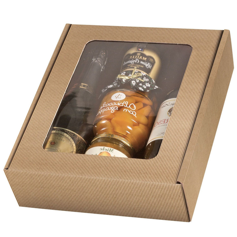Crea delle confezioni regalo raffinate e di qualità con le Cantinette in cartone onda. La finestra in PVC permette di mostrare in anteprima i tuoi articoli enogastronomici. L'eccellente qualità del cartone onda assicura un packaging robusta.